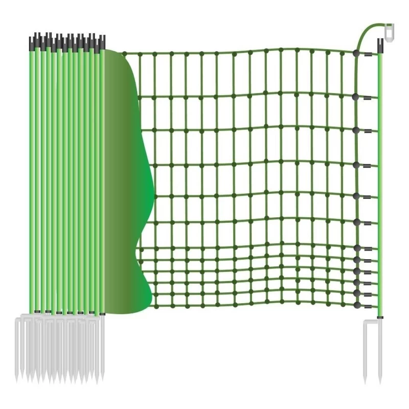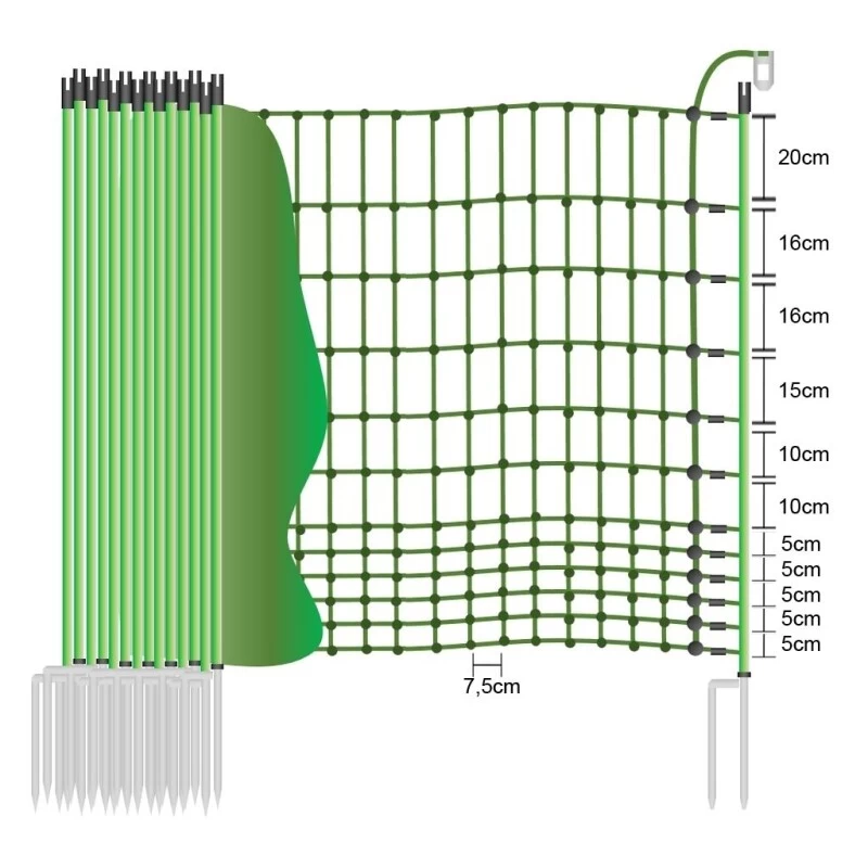 Die Geflügelnetz »Euronetz« Elektrozaun sind 112cm hoch und 50m lang. 12 horizontale Kunststofflitzen davon 11 mit eingearbeitetem Chromnickeldraht machen das Geflügelnetz auch zum Elektrozaun. 15 Pfähle mit Doppelspitze sind beim Elektronetz inklusive. Euro-Netze sind flexibel, da Unebenheiten mit extra Pfählen und Heringen ausgeglichen werden können. Die Bodenlitze beim Geflügelnetz sind verstärkt, 32 Kunststoffmonofile Ø 0,40mm, nicht stromführend. Restliche Litzen je 15 Kunststoffmonofile Ø 0,40mm, 3 Edelstahldrähte Ø 0,20mm. Die Senkrechten je 15 Kunststoffmonofile Ø 0,40 mm. UV-stabilisiert. Jeder Maschenkreuzungspunkt ist beim Geflügelnetz mit einer Kunststoffplombe unlösbar verschweißt