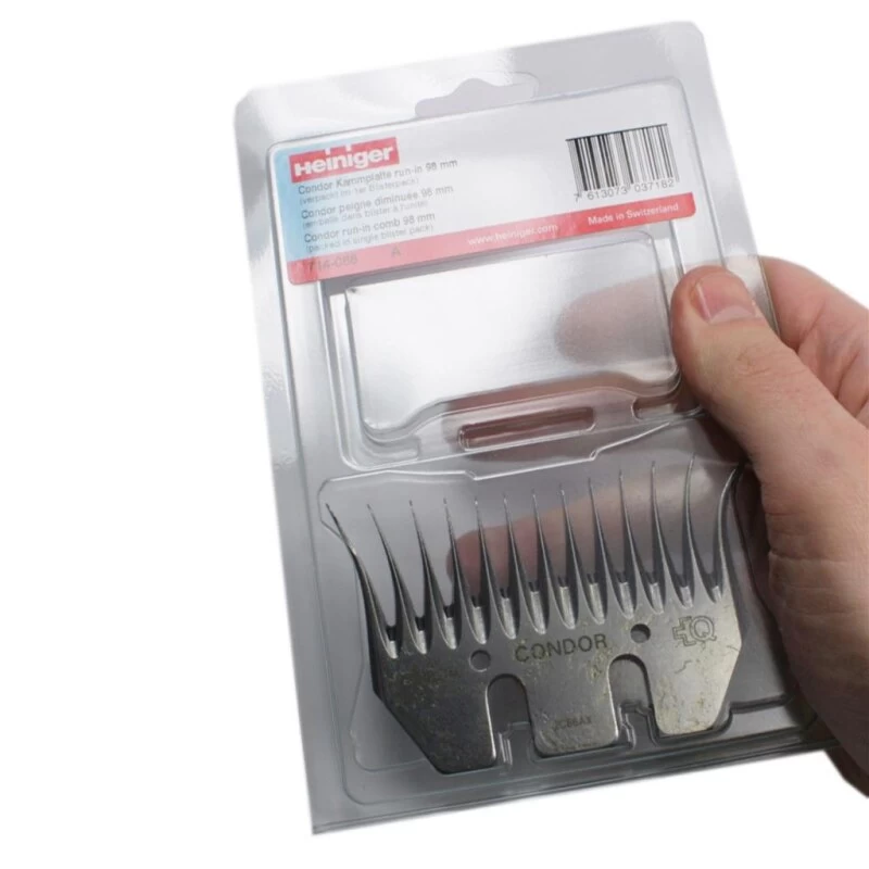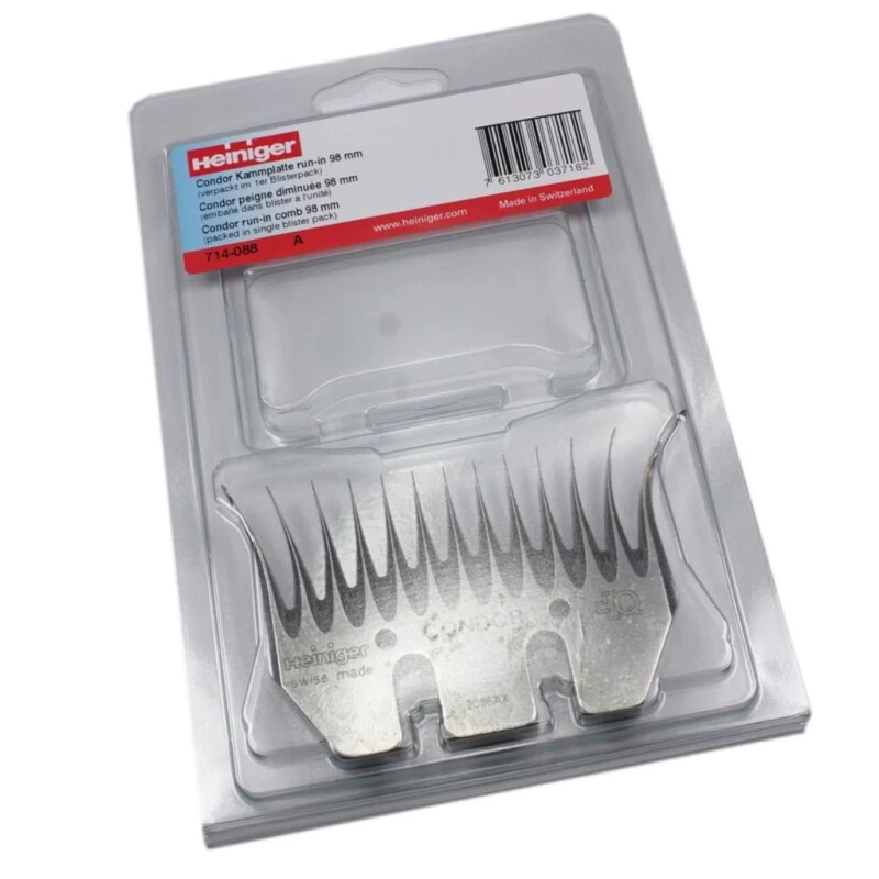 Heiniger Condor 714-088 Schermesser run-in 98mm. Für die professionelle Schur mit offener Wolle hergestellte Heiniger Schermesser. Das 98 mm breite Profil bietet eine optimale Schnittbreite. Gefertigte Schermesser aus Spezialstahl für lange Haltbarkeit. Nachschleifen ist mit den Schermessern mehrmals möglich.