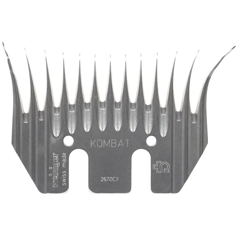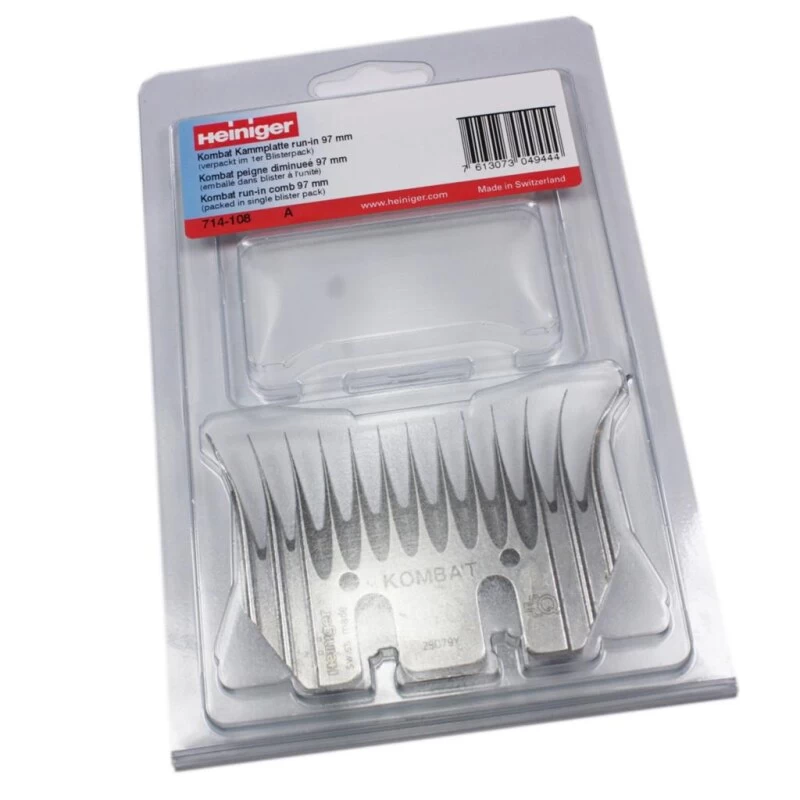 Heiniger Kombat 714-108 Schermesser run-in 97mm. Heiniger Schermesser für die professionelle Crossbred Schur. Der Kombat Kamm ist ein Run-In Kamm, der für die Schur von Crossbred Schafe entwickelt wurde. Dieser Scherkamm ist mit der neusten LG2 Technologie ausgestattet. Der Kombat ist ein anspruchsvoller Short Bevel Kamm, mit der innovativen LG2 Technologie, welche einen aussergewöhnlich leichten Eintritt in die Wolle erlaubt, und einen perfekten Fluss garantiert. Das verhindert Hautverletzungen und erlaubt eine schnellere Schergeschwindigkeit. Aus Spezialstahl gefertigte Schermesser mit langer Haltbarkeit. Mehrmaliges Nachschleifen ist mit den Schermessern möglich.