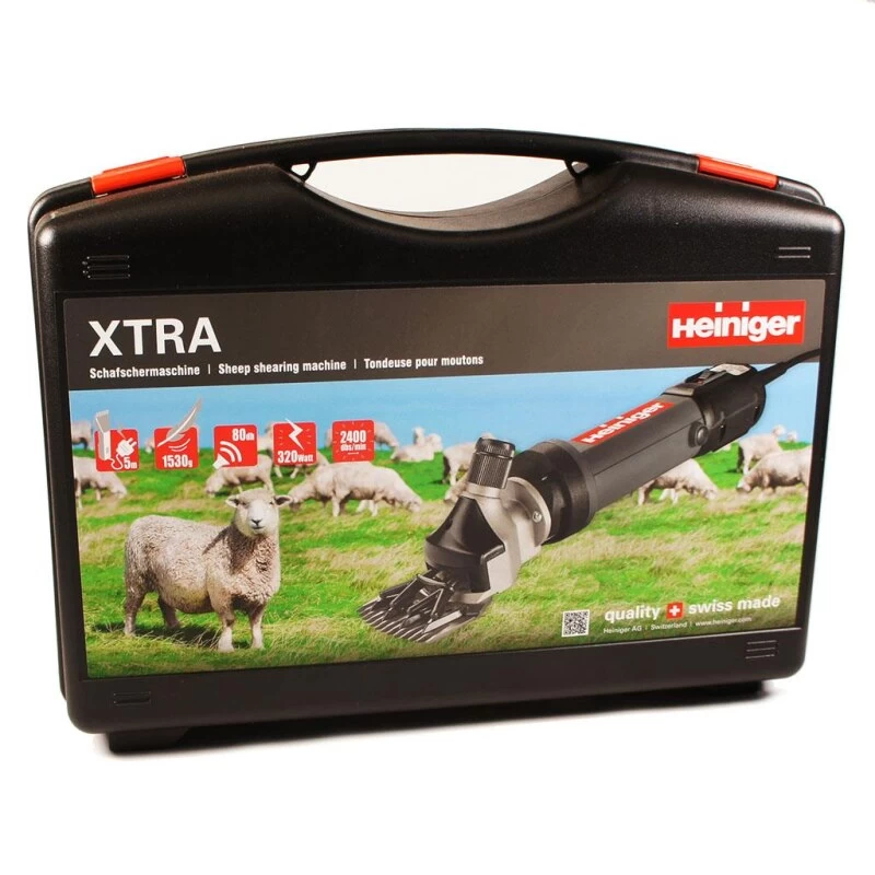 Die Schafschermaschine »Heiniger XTRA« inkl. Messersatz (Ovina und Edge, Schaf) ist eine kabelgebundene Profischermaschine. Die 1.530g leichte Heiniger XTRA ist eine kraftvolle Schermaschine mit 320 Watt starkem Motor. Trotz dieser Leistungspower arbeitet die XTRA Schafschermaschine bei einer guten Lautheit von 80 Dezibel. Die Schafschermaschine XTRA arbeitet mit schwebendem Druckgabel-System für die Schermesser dadurch wird weniger Druck benötigt und die Abnutzung der Messer wird um fast 50% reduziert.