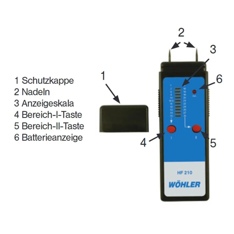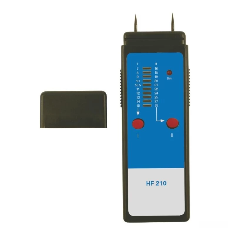Holzfeuchtemesser »HF 210« Messbereich 7-35% (9V). HF-210, mit Kunstlederhülle, Leuchtdiodenanzeige und 9V Batterie, Messbereich 7-35%.