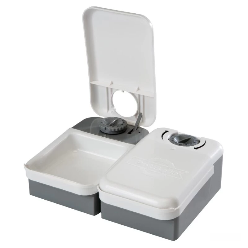 Der Futterautomat Katze »Classic« Katzenfutterautomat hat eine Größe von 2x150g. Mit dem benutzerfreundlichen batteriebetriebenen Zeitschalter lassen sich 2 Mahlzeiten innerhalb von 48 Stunden festlegen. Geeignet für Katzen und Hunde, beide Futterbehälter geschirrspülerfest, jeder Behälter fasst 150g Trockenfutter.