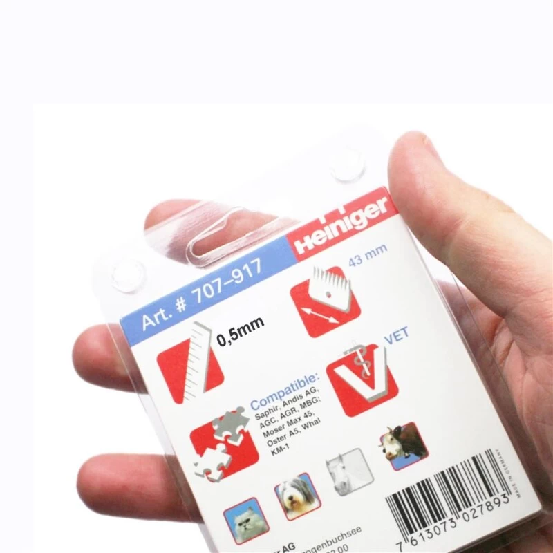Die Scherköpfe »Heiniger Saphir 30« mit einer Schnitthöhe von 0,5mm ist für VET, Katze und Hund geeignet.