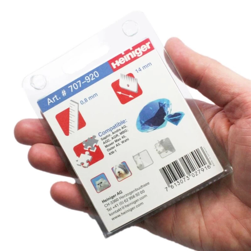 Die Scherköpfe »Heiniger Saphir 5/8« mit einer Schnitthöhe von 0,8mm sind zur Schur von Hunden und Katzen geeignet