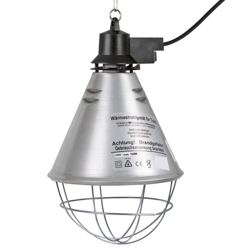 Die Stalllampe »Plus« Wärmelampe für Infrarot Rotlicht mit Sparschalter und 2,5m oder 5m Kabellänge. Reflektor mit Kette, Karabinerhaken und Deckenhaken, Kabel mit Schukostecker, 230 Volt maximal 150 Watt mit 2,5m – 5m Kabel und Sparschalter an der Lampe. Die Infrarot Lampe für den Stall ist ideal für die Aufzucht von Jungtieren in der Geflügelzucht (Kükenwärmer) und in der Schweinezucht (Ferkel Wärmer). Mit dem Sparschalter spart die Wärmelampe mit Infrarotbirne bis zu 50% Strom, kann aber dadurch auch nur mit bis zu 150 Watt Birnen bestückt werden.