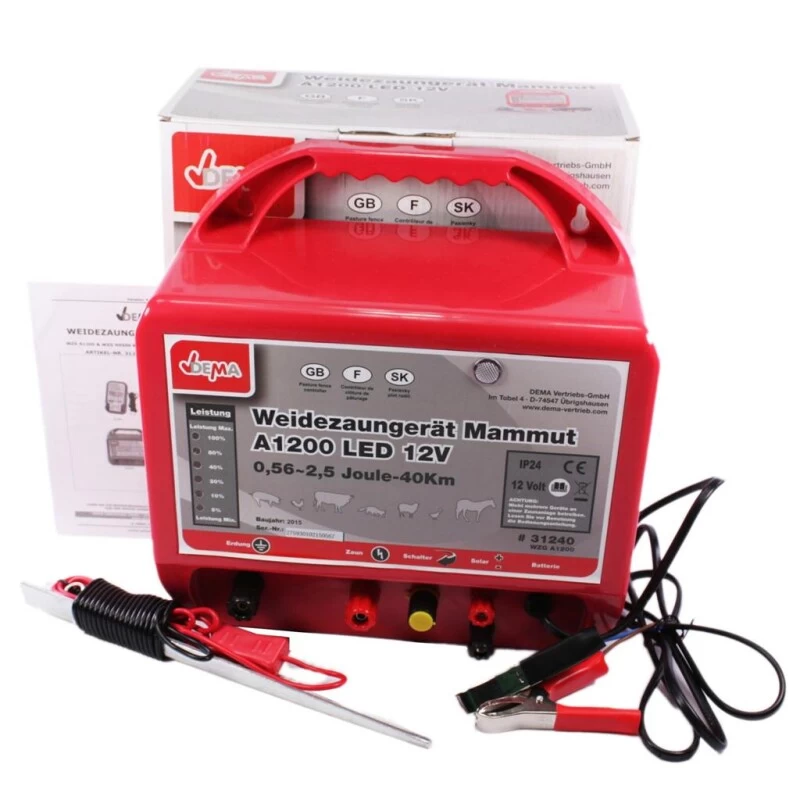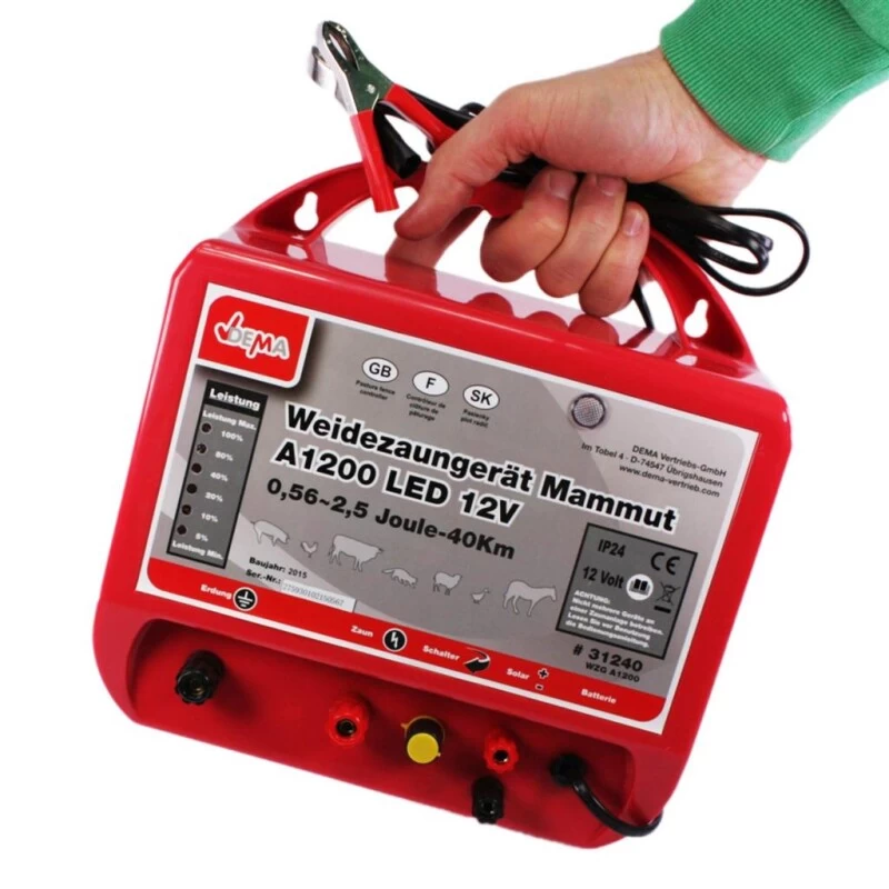 Das Mammut A1200 von DEMA ist schlagstark und überzeugt absolut im Hobbybereich. Leider ist das 12v Weidegerät im Einsatz aber ziemlich laut und hat keinen Tiefenentladungsschutz für den Weidezaunakku. Wir empfehlen es nicht „geräuschedammend“ einzuwickeln (wird heiß), sondern sich dann eines unserer Profi Weidezaungeräte anzuschauen. Außerdem ist der mitgelieferte Erdpfahl einfach nicht tief genug für professionelle Weidezaunanlagen.